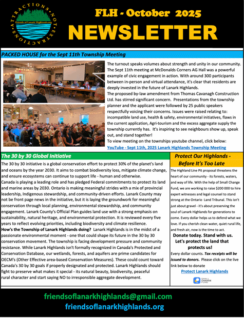 Friends of Lanark Highlands would like to thank everyone who attended the Lanark Highlands public meeting on September 11th, both in person and online. Your participation is very much appreciated. Community members presented themselves respectfully and provided valuable information to the Township as Council received public input regarding the Highland Line Pit Proposal.